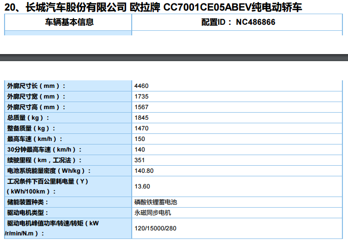 根据新能源汽车推广目录11月份信息,长城欧拉iQ换装磷酸铁锂,工况法续航里程从421公里降至351公里,系统能量密度140.8wh/kg,百公里耗电13.6度。