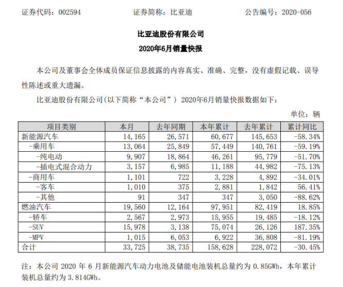 公告还披露,公司2020年6月新能源汽车动力电池及储能电池装机总量约为0.85GWh,本年累计装机总量约为3.814GWh。