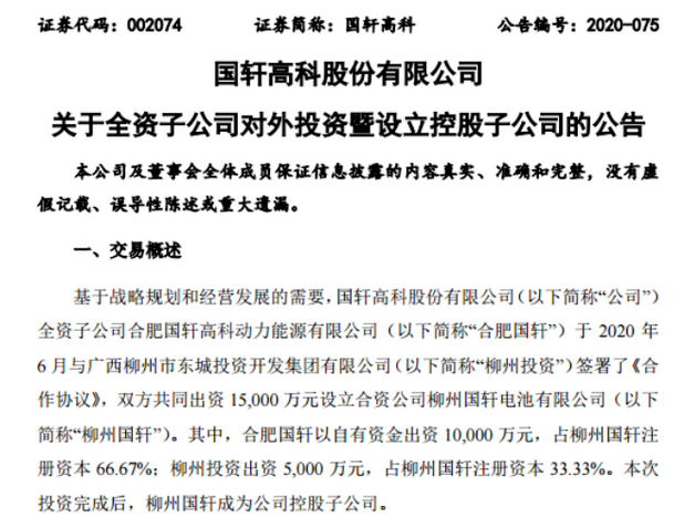 其中,合肥国轩以自有资金出资1亿元,占柳州国轩注册资本66.67%;柳州投资出资5000 万元,占柳州国轩注册资本 33.33%。本次投资完成后,柳州国轩成为公司控股子公司。