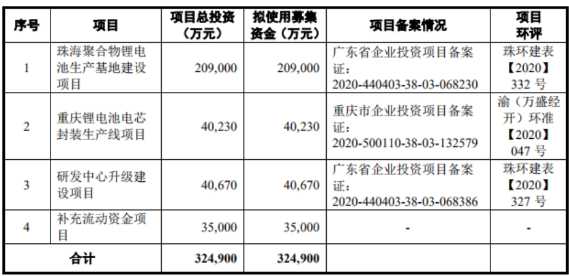 据招股书披露,本次珠海冠宇IPO募集资金投资项目为珠海聚合物锂电池生产基地建设项目、重庆锂电池电芯封装生产线项目、研发中心升级建设项目及补充流动资金项目,和发行人主营业务息息相关。