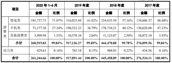 业绩方面,据招股书披露,2017年、2018年、2019年和2020年1-6月,珠海冠宇营业收入分别为293,505.67万元、474,695.09万元、533,105.08万元和269,615.88万元,其中主营业务收入全部为核心技术产品收入。