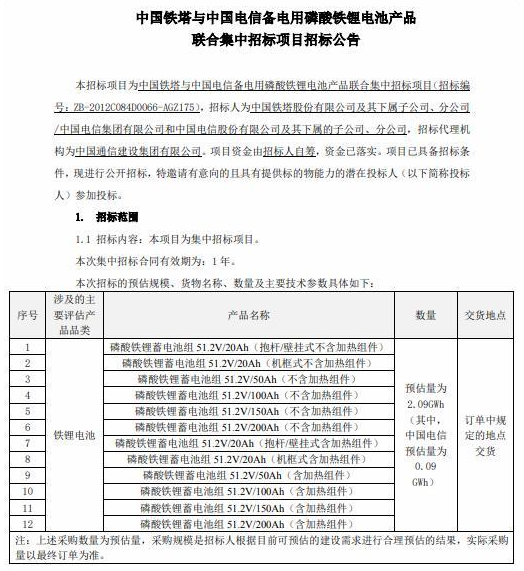 近日,《中国铁塔与中国电信备电用磷酸铁锂电池产品联合集中招标项目招标公告》正式发布。该招标项目的编号为ZB-2012C084D0066-AGZ175,邀请有意向的且具有提供标的物能力的潜在投标人参与投标。
