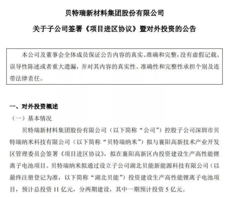 贝特瑞12日公告称,公司下属子公司深圳市贝特瑞纳米科技有限公司,拟与襄阳高新技术产业开发区管理委员会签署《项目进区协议》,拟在襄阳高新区内投资建设生产高性能锂离子电池项目。贝特瑞纳米拟通过设立子公司湖北贝能新能源科技有限公司,投资建设生产高性能锂离子电池项目, 预计总投资11亿元人民币,项目分两期建设,其中一期预计投资5亿元。