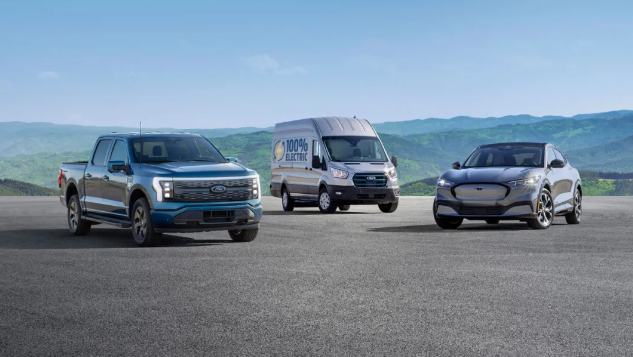从左至右:福特纯电智能皮卡F-150 Lightning、福特全顺纯电动版、纯电SUV Mustang Mach-E