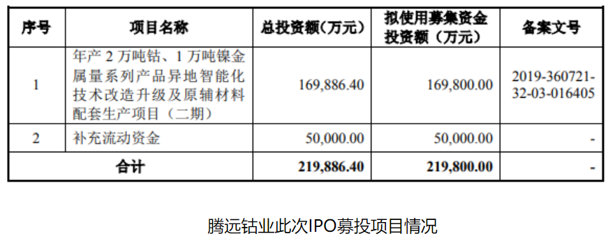 腾远钴业此次IPO计划募资21.98亿元,最终募资54.78亿元,扣除发行费用后,将用于年产2万吨钴、1万吨镍金属量系列产品异地智能化技术改造升级及原辅材料配套生产项目(二期)(拟投入募集资金16.98亿元)以及补充流动资金(拟投入募集资金5亿元)。