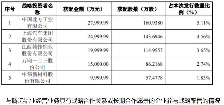 在参与战略配售的6名对象中,与腾远钴业经营业务具有战略合作关系或长期合作愿景的大型企业或其下属企业包括:中国北方工业有限公司、万向一二三股份公司、上海汽车集团股份有限公司、中伟新材料股份有限公司和江西赣锋锂业股份有限公司。