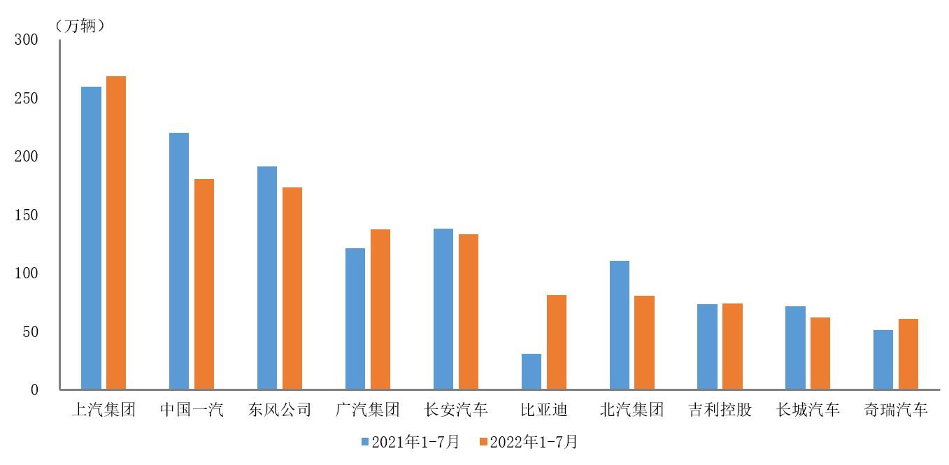 8月24日,据中国汽车工业协会统计分析,2022年1-7月,汽车销量排名前十位的企业(集团)共销售1248.7万辆,占汽车销售总量的86.3%。在汽车销量排名前十位企业中,与上年同期相比,比亚迪(002594.SZ)销量增速最为明显,奇瑞和广汽(601238.SH)也呈两位数较快增长,上汽(600104.SH)和吉利(00175)略有增长,其他企业均呈下降