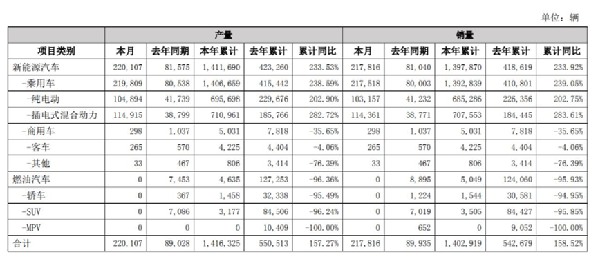产量方面,10月比亚迪新车产量合计22.01万辆,上年同期为8.9万辆;1-10月,比亚迪累计产量为141.63万辆,同比增长157.27%。