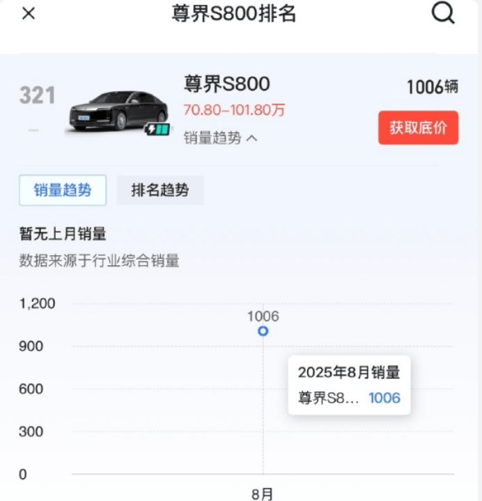 9月9日,据第一财经报道,华为与江淮汽车合作推出的鸿蒙智行品牌旗下首款量产车尊界S800首月零售销量达到1006辆。尊界S800售价70.8万至101.8万元,预计8月销量为江淮汽车带来7亿至10亿元的营收贡献。华为常务董事余承东宣布,尊界S800上市67天大定突破10000台。博主@孙少军09预测,9月交付量应在1500辆左右,而第四季度产能有望提升至两三千辆。