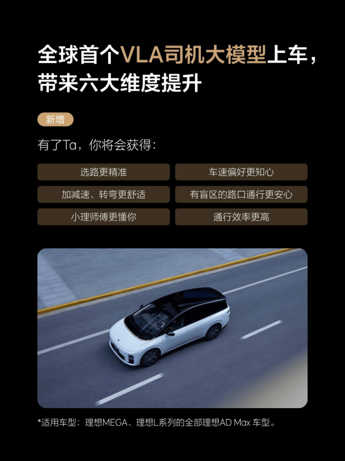 理想汽车宣布正式开启OTA 8.0版本更新,此次更新包含54项新增功能和26项体验优化。全球首个VLA(Vision-Language-Action)司机大模型的上车,将带来六大维度的提升,包括更精准的选路、更贴心的车速偏好等。新增的VLA指挥功能允许用户通过简单的语音指令完成复杂的路径规划。此外,理想汽车还推出了增强型自动紧急避让(AES)功能,适用于搭载理想AD Pro 4.0辅助驾驶系统的车型,新增连续避让、前后夹击场景的自动紧急避让能力。理想汽车CEO李想发文称,随着OTA 8.0版本的发布,理想汽车在辅助驾驶和智能座舱方面从“局部领先”进入“全面领先”。