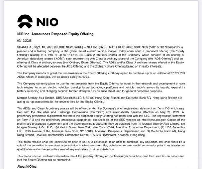 蔚来汽车宣布计划发行1.818亿股A类普通股,包括美国存托股份(ADS)的发行。此次股权发行所得款项净额将主要用于投资智能电动汽车核心技术的研发、开发未来技术平台和车型、扩大电池更换和充电网络,以及增强公司资金实力,为蔚来的长期发展提供资金支持。摩根士丹利亚洲有限公司、瑞银证券有限责任公司、瑞银集团香港分行和德意志银行香港分行担任本次股票发行承销商的代表。