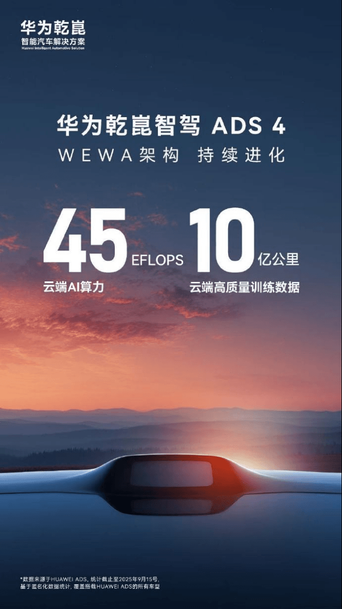 华为乾崑智能汽车解决方案发文分享,其智能驾驶系统ADS 4支持WEWA架构(世界引擎 + 世界行为模型),具备45EFLOPS的云端AI算力和10亿公里的高质量训练数据。这些数据相当于一位经验丰富的司机在各种极端路况下行驶了10万年,而算力则相当于200万台游戏电脑同时满负荷工作,能够快速迭代算法。ADS 4的升级将在9月中下旬陆续推送给鸿蒙智行全系搭载辅助驾驶的车型。