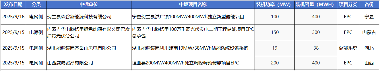 9月15日,内蒙古华电腾格里绿色能源有限公司巴彦浩特光伏分公司发布内蒙古华电腾格里100万千瓦光伏发电 二期工程储能项目EPC总承包招标公告。项目位于内蒙古自治区阿拉善盟阿拉善左旗巴彦浩特镇,本项目为内蒙古华电腾格里基地100万千瓦光伏发电二期工程150MW/300MWh储能系统,分别布置于两座已投运的220kV升压站内。其中,#1升压站内储能电池布置50MW/100MWh储能系统,#3升压站内储能电池布置100MW/200MWh储能系统。储能系统总规模150MW/300MWh。