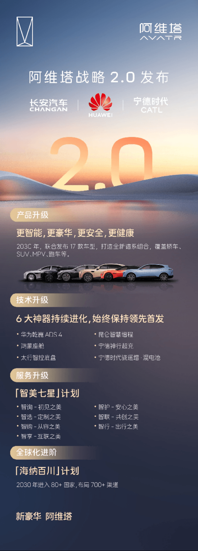 阿维塔战略2.0正式发布,长安汽车、华为、宁德时代三方合作,致力于产品技术服务全维升级,加速全球化发展。阿维塔计划到2030年联合发布17款车型,覆盖轿车、SUV、MPV、跑车等,技术升级包括华为乾崑ADS 4、昆仑智慧增程等六大神器。服务方面,推出“智美七星”计划,涵盖智询、智护、智选等服务。全球化方面,提出“海纳百川”计划,目标2030年进入80+国家、布局700+渠道。
