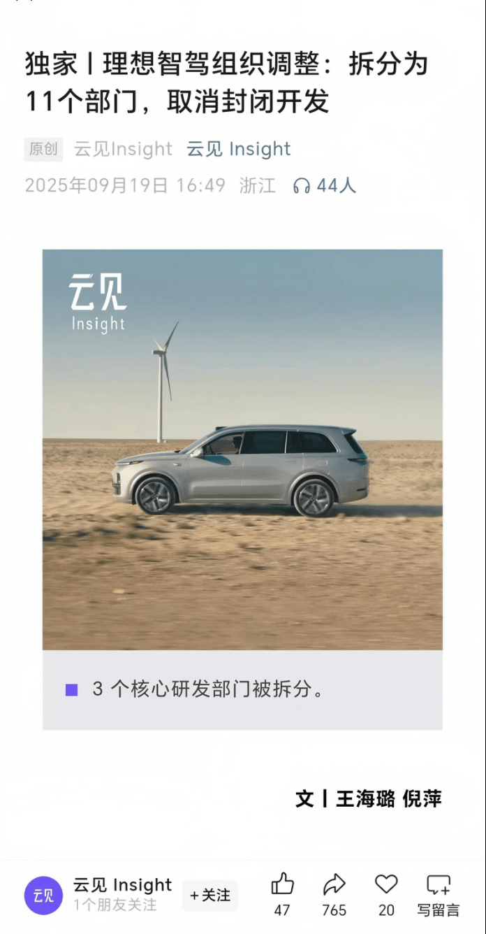 9月19日,据“云见 Insight”消息,理想汽车自动驾驶部门进行了组织结构的重大调整。此前,该部门由三个核心研发团队组成,分别由贾鹏、夏中谱和王佳佳负责VLA和世界模型、端到端模型和量产研发。然而,这三位负责人均在今年提出离职并选择创业。在新的组织架构中,理想汽车将原有的三个二级部门拆分为11个,涉及模型算法、量产研发和数据闭环等多个领域,由侯文博、詹锟、赵志勇等人负责。同时,新增了创新业务部,由原数据闭环负责人佘党恩管理,负责对外技术合作与预研、海外发展等。