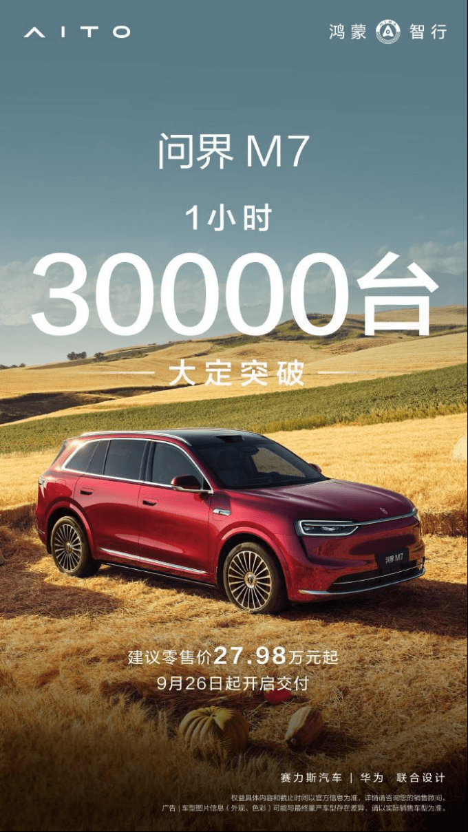 国民SUV全新问界M7正式上市,在上市发布会上,余承东宣布,问界M7在5分钟内大定订单量突破10000台,预售19天以来,小订累计突破23万辆。新车一小时大定破 3 万台。全新问界M7提供增程和纯电两种动力版本,各三款车型共12款车型,增程版售价区间为27.98-35.98万元,纯电版售价区间为31.98-37.98万元。同时,在今日的鸿蒙智行秋季新品发布会上,赛力斯汽车总裁何利扬表示全新问界 M7 是基于全新产线打造,超级工厂月峰值产能突破 3 万台,保障新车发布即交付。产线实现新材料、新工艺与超 800 个 AI 检测点,还有 10 万 + 用户场景、1300 万公里路试验证。