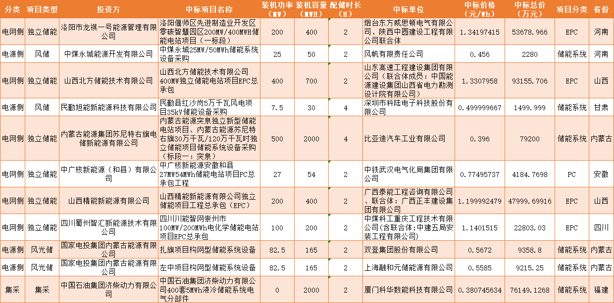 储能系统最低中标价为0.396元/Wh,由比亚迪在内蒙古能源突泉独立新型储能电站项目、内蒙古能源苏尼特右旗30万千瓦/120万千瓦时独立储能项目储能系统设备采购(标段一:突泉)报出,项目中标总价79200万元,项目规模500MW/2000MWh。