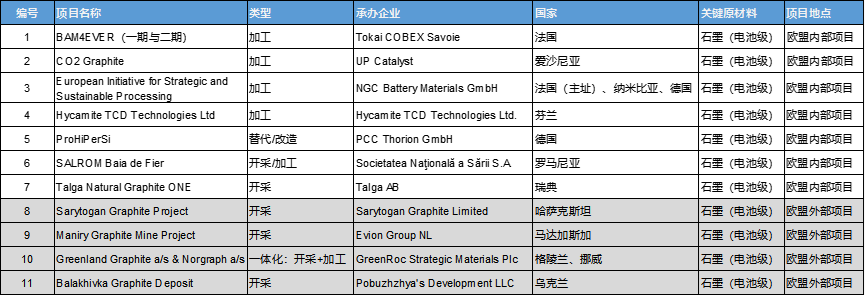 2025 年 9 月 25 日,欧盟委员会第二次呼吁建设战略项目以确保关键原材料供应,并公布了《关键原材料法案(CRMA)》下的战略项目。欧盟负责繁荣和工业战略的执行副总裁 Stéphane Séjourné 当天宣布启动第二次战略项目征集,以确保欧洲工业关键原材料的安全和可持续供应。此项公告是在瑞典基律纳宣布的,也是在欧盟第一次电话会议取得成功的基础上发布的,第一次电话会议选择了 60 个战略项目,包括47个欧盟内部战略项目和13个欧盟以外的战略项目。其中有11个石墨相关的战略项目。