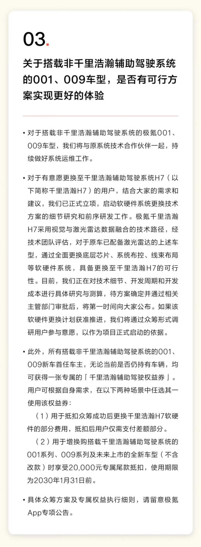 此外,所有搭载非千里浩瀚辅助驾驶系统的001、009新车首任车主,无论是否仍持有车辆,均可获得一张专属的“千里浩瀚辅助驾驶权益券”,用于抵扣更换千里浩瀚H7软硬件的部分费用或增换购搭载千里浩瀚辅助驾驶系统的车型时享受专属尾款抵扣。具体众筹方案及权益执行细则将在极氪App专项公告中发布。