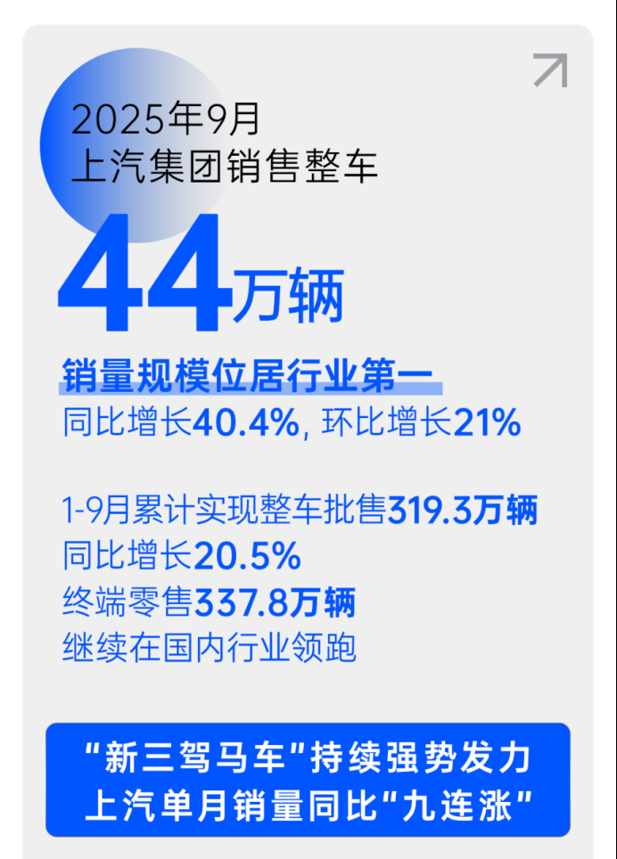 上汽集团发布2025年9月产销快报,显示9月份销售整车44万辆,同比增长40.4%,环比增长21%,销量规模在行业中排名第一。今年1-9月,上汽集团累计实现整车批售319.3万辆,同比增长20.5%,终端零售337.8万辆,继续在国内行业中保持领先地位。9月份,上汽自主品牌销售29.4万辆,同比增长50.4%,其中新能源车销售近19万辆,同比增长46.5%。今年以来,上汽月销量已实现同比“九连涨”。