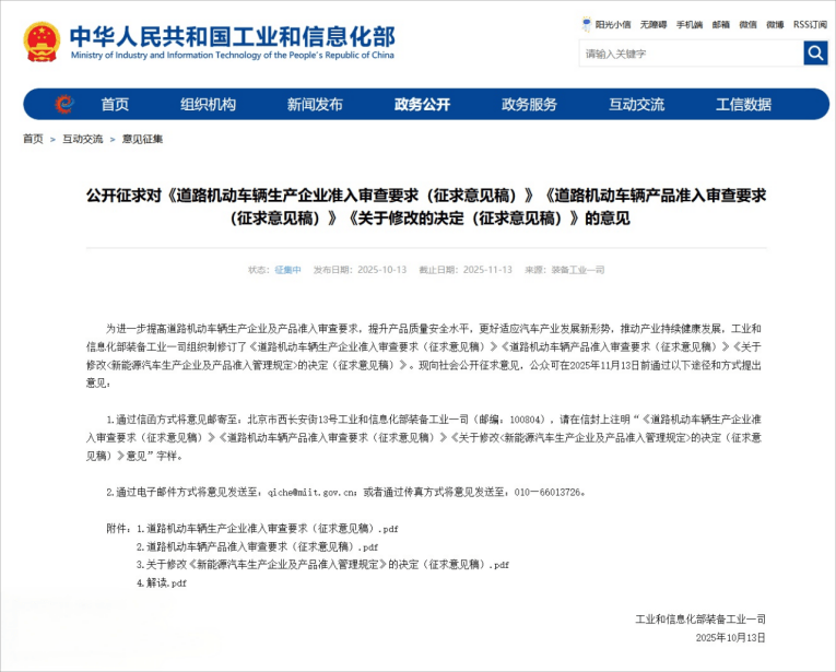 工业和信息化部装备工业一司发布公告,公开征求《道路机动车辆生产企业准入审查要求》《道路机动车辆产品准入审查要求》《关于修改<新能源汽车生产企业及产品准入管理规定>的决定》意见。《企业审查要求》主要通过提高企业智能化、网联化能力要求和生产准入门槛,增加集团化管理要求,以及优化新能源汽车准入审查要求等方面进行调整,以强化企业产品安全质量和售后服务保障能力。