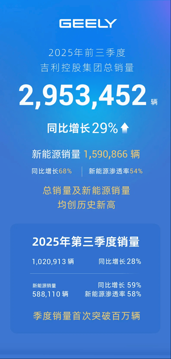 具体到品牌层面,吉利汽车控股有限公司前三季度销量为217万辆,同比增长46%,新能源车型总销量达到117万辆,同比增长114%。吉利中国星前三季度销量超过91万辆,同比增长5%;吉利银河前三季度销量为87.5万辆,同比增长206%;领克品牌前三季度销量超过24万辆,同比增长24%;极氪品牌前三季度销量超过14万辆。
