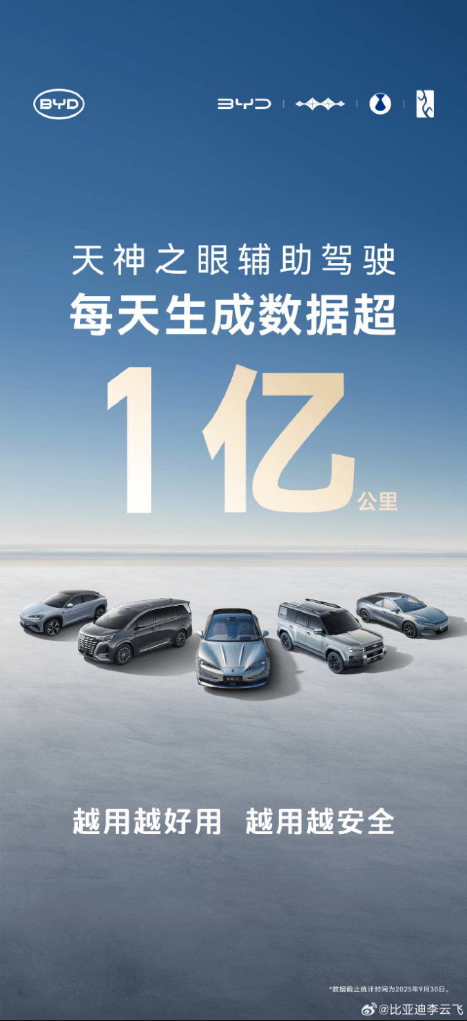 比亚迪集团-品牌及公关处总经理李云飞宣布,其天神之眼辅助驾驶系统每天数据生成量已突破1亿公里,截至2025年9月30日,搭载该系统的智驾车型累计销量超过170万辆。比亚迪天神之眼智驾车型9月销量情况显示,王朝系列和海洋系列共售出266248辆,方程豹汽车售出21667辆,腾势汽车售出6986辆,仰望汽车售出705辆。