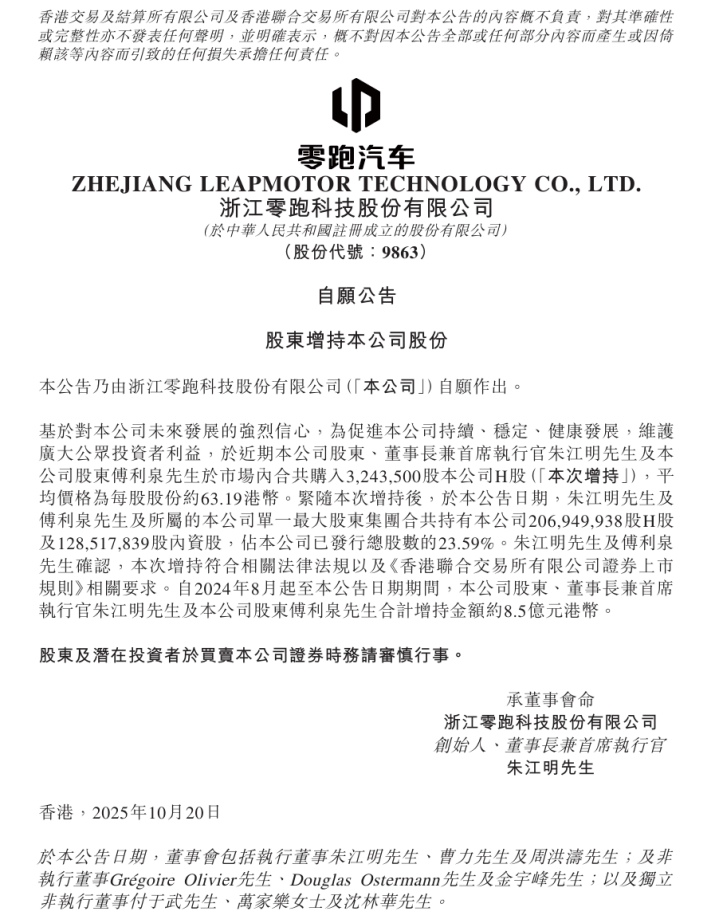 零跑汽车发布公告,公司股东、董事长兼首席执行官朱江明先生及股东傅利泉先生近期在市场内增持了3,243,500股H股,增持平均价格约为每股63.19港币,涉及金额约2亿港币。此次增持后,朱江明先生及傅利泉先生及其关联的单一最大股东集团共持有206,949,938股H股及128,517,839股内资股,占公司已发行总股数的23.59%。朱江明先生及傅利泉先生确认,此次增持符合相关法律法规及香港联合交易所有限公司证券上市规则的要求。