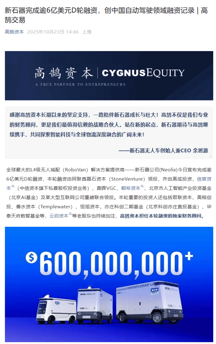 全球最大的L4级无人城配解决方案提供商新石器公司(Neolix)宣布完成逾6亿美元D轮融资,约合42.57亿元人民币。本轮融资由阿联酋磊石资本领投,高成投资、信宸资本、鼎晖VGC、朝希资本、北京市人工智能产业投资基金及某大型互联网公司联合领投,云启资本等老股东持续加注,高鹄资本担任独家财务顾问。这是中国自动驾驶领域迄今为止最大的一笔私募融资,也是今年中国私募领域最大的融资之一。
