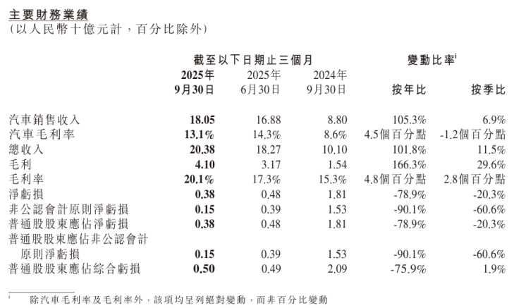 小鹏汽车发布了2025年第三季度的财务业绩。营收达到203.8亿元,同比增长102%,略低于市场预估的204.5亿元。净亏损为3.8亿元,较2024年同期的18.1亿元和2025年第二季度的4.8亿元有所减少。非公认会计原则净亏损为1.5亿元,较2024年同期的15.3亿元和2025年第二季度的3.9亿元显著降低。毛利率提升至20.1%,较2024年同期上升4.8个百分点。第三季度汽车总交付量为116,007辆,同比增长149.3%。