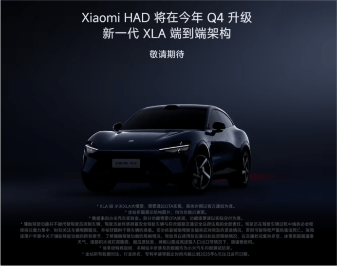 小米官网更新了XLA大模型的更准确升级时间,Xiaomi HAD辅助驾驶将在今年Q4升级新一代XLA端到端架构(XLA 指小米 XLA 大模型),具体升级时间未公布,但预计将在本月或12月完成。