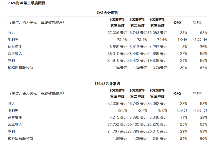 汽车业务收入5.92亿美元,环比增长1%,同比增长32%。英伟达推出NVIDIA DRIVE AGX Hyperion™ 10自动驾驶汽车开发平台,助力构建L4级车队,并与Uber合作,计划从2027年起扩大全球最大的L4级自动驾驶出行网络,目标部署10万辆汽车。此外,英伟达与多家美国制造业及机器人领域领军企业合作,推动物理人工智能在美国的再工业化,并发布IGX Thor™工业级平台,将实时物理AI带到边缘。游戏和人工智能电脑业务方面,第三季度游戏收入为43亿美元,环比下降1%,同比增长30%。英伟达发布多款支持DLSS 4和Reflex的游戏,并推出RTX Remix更新和AI工具性能提升。专业可视化业务营收为7.6亿美元,环比增长26%,同比增长56%,公司开始发售NVIDIA DGX Spark™,这是世界上最小的AI超级计算机。