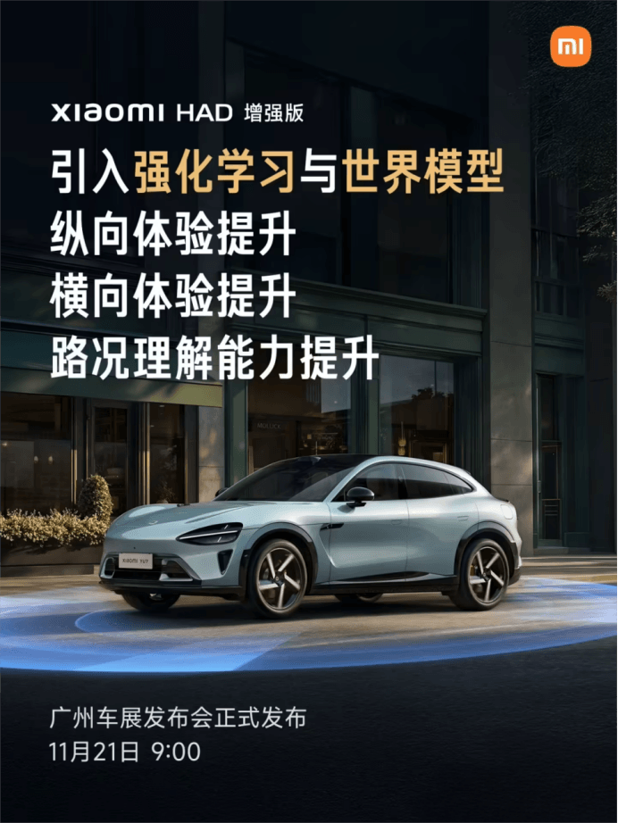 小米汽车副总裁李肖爽发文称小米汽车端到端辅助驾驶系统「Xiaomi HAD 增强版」将于11月21日在广州车展发布。该系统引入了「强化学习」与「世界模型」技术,通过在模拟环境中反复练习和奖惩机制,优化驾驶策略。小米汽车副总裁李肖爽表示,增强版在纵向和横向体验以及路况理解能力上都有显著提升。