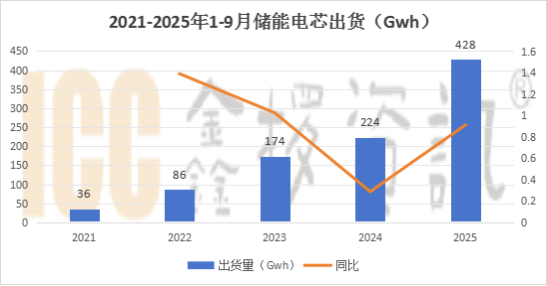 据ICC鑫椤储能数据库统计,2025年1-9月全球储能电池出货428Gwh,同比增长90.7%。