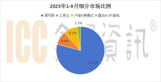 分市场来看:源网侧出货占比79.2%,工商业占比9.4%,户储&便携式占比9.1%,基站&数据中心备电占比2.3%,主要得益于源网侧储能需求的增量。
