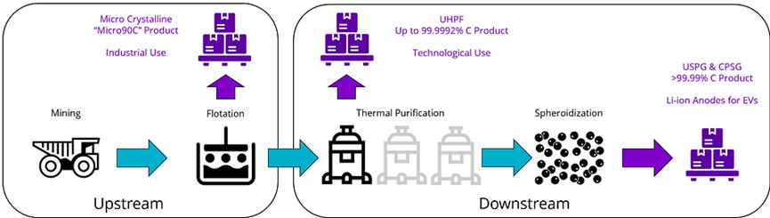 该项目热电厂设计处理速率为22,500吨/年,分为三条产线,每条名义产能为7,500吨/年。该热电厂将设计为全天候24小时运行,分两阶段建设,起始为第一条产线(第一阶段),第三年采矿时增加额外两条采矿列车(第二阶段)。球化石墨在1b阶段以试点尺度加入,2b阶段则考虑石墨膨胀的问题,同时增加涂覆环节。