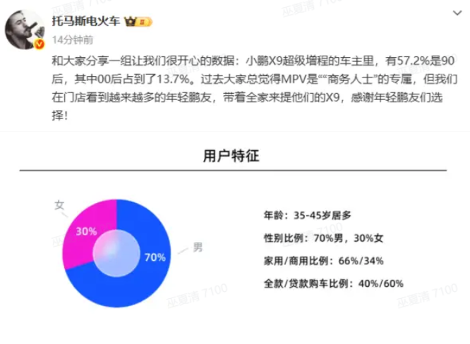 小鹏副总裁:X9超级增程车主90后占57.2%,00后占13.7%
