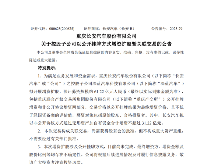 长安汽车发布公告,其控股子公司深蓝汽车科技有限公司计划进行增资扩股,预计募资规模约为61.22亿元人民币。此次增资包括重庆产交所公开挂牌增资和非公开协议增资两部分,增资价格将根据公开挂牌结果确定,且不低于国资备案的评估值。募资对象将包括原始股东和合格投资者。长安汽车计划以非公开协议方式参与增资,增资规模不超过31.22亿元,其中无形资产评估价值为10.43亿元,其余以现金方式增资,资金来源于自有资金。增资后,长安汽车将保持对深蓝汽车的控股比例不变,仍为50.9959%。