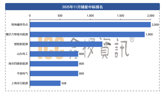 11月储能系统中标排名前列的厂商有:珠海横琴奇点、重庆万帮星充能源、楚能新能源、山东电工、南京四象新能源、平高电气、上海采日能源等多家企业,其中珠海横琴奇点借着中国电建吉林院磴口100万千瓦400万千瓦时电源侧独立储能项目子项目1EPC总承包项目储能系统设备采购项目中标名列本月第一。
