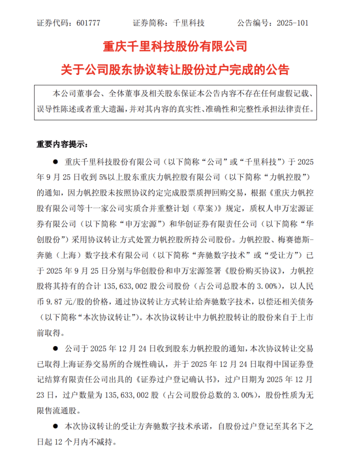 千里科技宣布已完成与梅赛德斯-奔驰(上海)数字技术有限公司的股份过户登记,奔驰数字技术以9.87元/股的价格获得力帆控股持有的135633002股股份,占公司总股本的3.00%。此次股权过户标志着奔驰正式成为千里科技第五大股东,交割正式完成。此前,梅赛德斯-奔驰集团计划投资重庆千里科技股份有限公司,以提升其在中国的软件实力。浙江吉利控股集团作为千里科技的主要股东之一,主导推动奔驰参与投资,并将自动驾驶业务整合到千里科技,使其成为集团未来智能驾驶技术的核心平台。