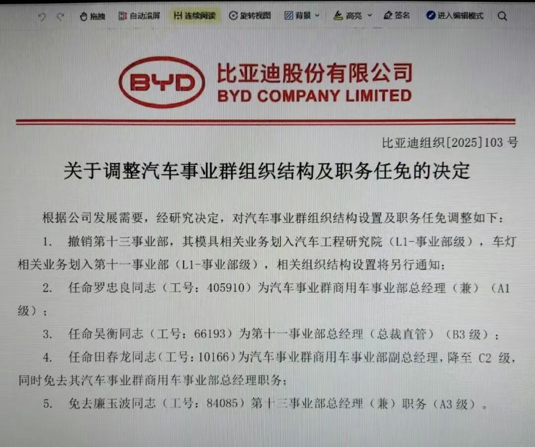 与此同时,一批高管职务发生变动:罗忠良兼任汽车事业群商用车事业部总经理;吴衡担任第十一事业部总经理,直接向总裁汇报;田春龙调任商用车事业部副总经理,不再担任原总经理职务;廉玉波卸下第十三事业部总经理的兼职。目前,比亚迪主要事业板块包括汽车、电池、电子、海外销售等事业群,以及若干独立事业部和集团职能部门。