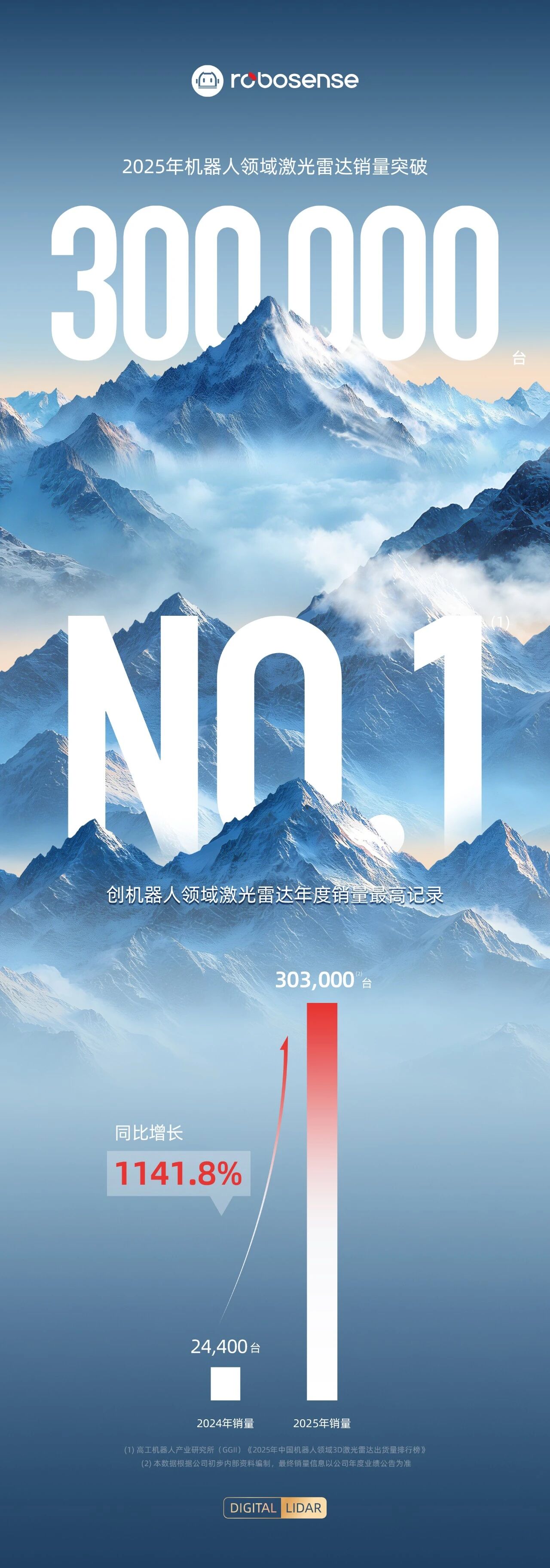 1月13日,RoboSense速腾聚创宣布,2025年机器人领域激光雷达产品销量达303,000台。相较2024年,RoboSense机器人领域产品销量同比强劲增长1141.8%。