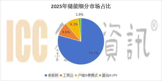2025年表前侧储能市场占比79.2%,工商业储能市场占比9.6%,户储&便携式储能市场占比9.3%,基站&数据中心备电市场占比2%。