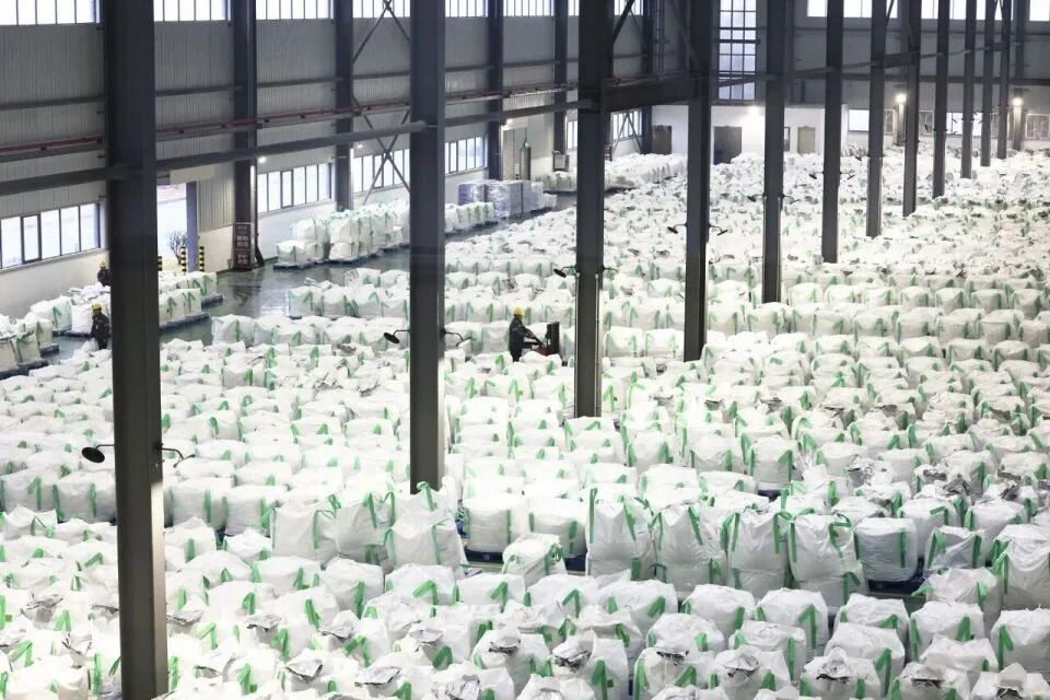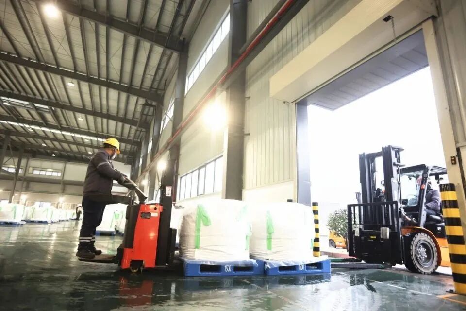 ▲宜昌邦普磷酸铁锂待检区,管理员正在运送已检测完成的产品。