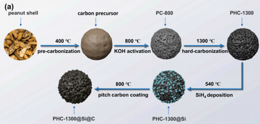在上述研究中,选择低成本且天然丰富的花生壳作为前驱体,通过氢氧化钾活化后在1300°C下碳化合成多孔硬碳。随后,通过化学气相沉积(CVD)将纳米硅沉积到多孔硬碳基体上,并对沉积的硅产物进一步进行碳涂层处理,最终获得结构稳定的 PHC -1300@Si@C复合材料。