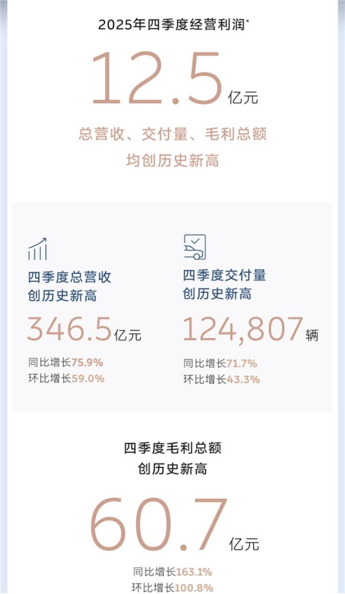 交付量方面,四季度共交付新车124,807台,同比增长71.7%,环比增长43.3%,创历史新高。营收方面,四季度实现营收346.5亿元,同比增长75.9%,环比增长59.0%,同样创下历史新高。盈利能力大幅提升,四季度毛利总额60.7亿元,同比增长163.1%,环比增长100.8%,创历史新高。综合毛利率达17.5%,同比增长5.8个百分点,环比增长3.6个百分点,为2022年以来新高。整车毛利率18.1%,同比增长5.0个百分点,环比增长3.4个百分点,创三年新高,整车业务盈利能力显著提升。其他销售毛利率11.9%,同比增长10.8个百分点,环比增长4.1个百分点,其他销售业务连续三个季度盈利,服务与社区业务贡献稳健增长。全年共交付新车326,028台,同比增长46.9%,创历史新高。全年营收874.9亿元,同比增长33.1%,创历史新高。全年毛利总额119.2亿元,同比增长83.5%,创历史新高。全年综合毛利率13.6%,同比增长3.7个百分点,全年整车毛利率14.6%,同比增长2.3个百分点,均为2022年以来新高。