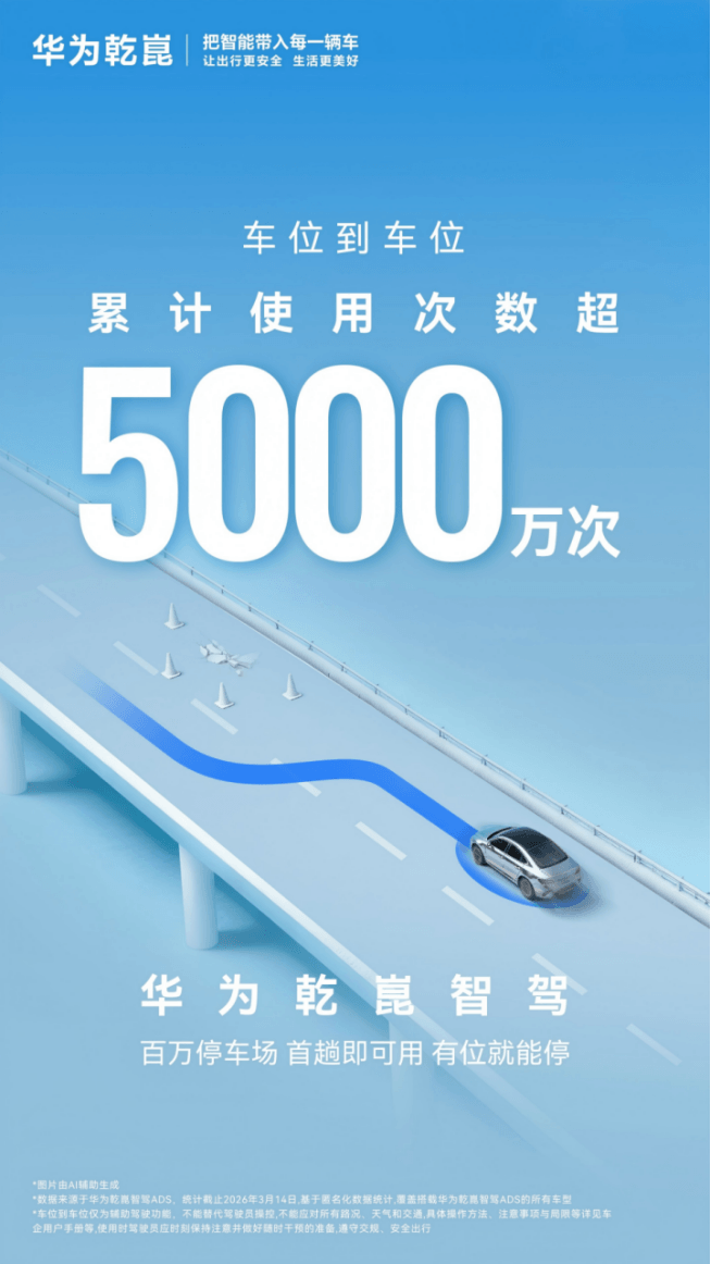 3月23日消息,华为乾崑智能汽车解决方案官方微博宣布,华为乾崑智驾车位到车位累计使用次数突破5000万次。这一数据来源于华为乾崑智驾ADS,统计截止2026年3月14日,基于匿名化数据统计,覆盖搭载华为乾崑智驾ADS的所有车型。华为官方强调,车位到车位2.0仅为辅助驾驶功能,不能替代驾驶员操控,不能应对所有路况、天气和交通。