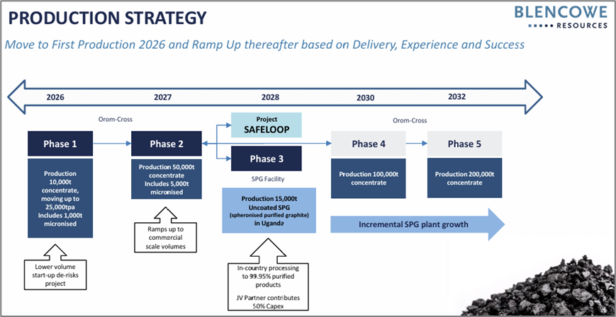 去年底(2025年12月),该公司公告,位于乌干达的奥罗姆-克罗斯石墨项目(Orom-Cross Graphite Project)在第一阶段(Phase 1)将具备2万吨石墨精矿年产能,预计于2027年上半年投产;并将在第二阶段(Phase 2)把年产能扩大至7万吨石墨精矿,并建设2万吨无涂覆球化高纯石墨(USPG),第二阶段则计划在第一阶段启动后两年内实施。该公司的最终目标是通过阶段性扩建,将项目产能提升至年产17.5万吨石墨精矿及2万吨无涂覆球化高纯石墨(USPG)。