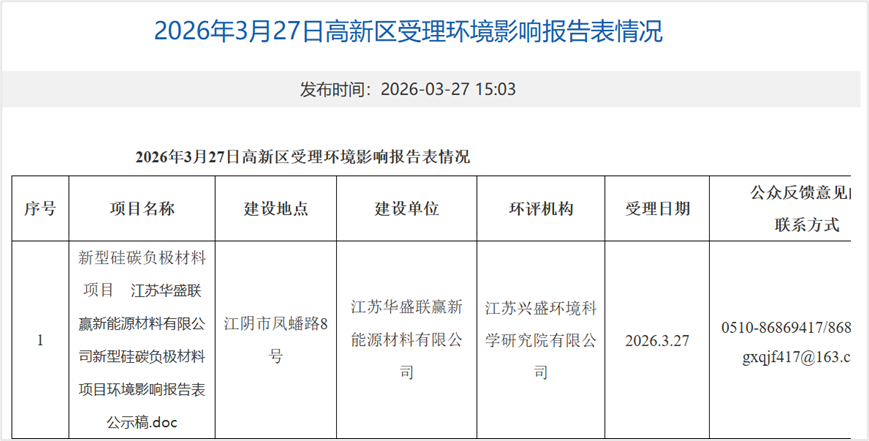 3月27日,江阴市人民政府发布江苏华盛联赢新能源材料有限公司新型硅碳负极材料项目受理环境影响报告表。