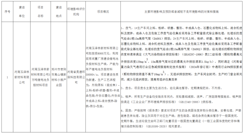 3月23日郑州市生态环境局荥阳分局受理了河南玉泽林新材料有限公司5万吨锂电池负极材料项目。